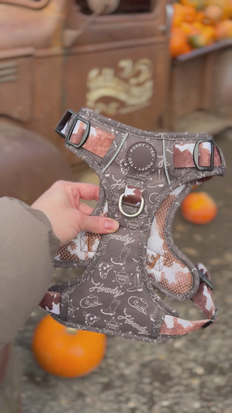 This design showcases hand drawn cowboy illustrations, from boots and hats to cows and "sheriff" Good Dog badge. Paired with Cowprint straps and chocolate brown and brushed silver branding and hardware - this harness delivers western charm with premium quality with BRAND NEW additional reflective trim for added safety on low light walks.